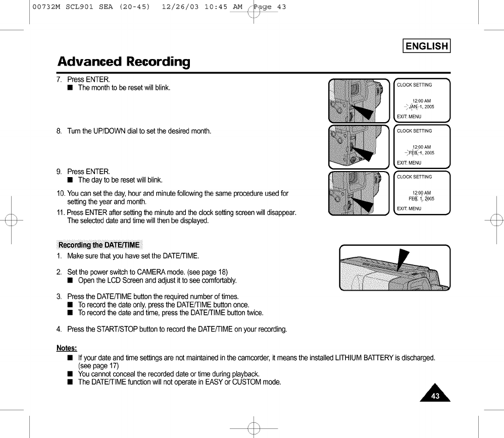 • If your dateand timesettingsare notmaintainedinthe camcorder,it meanstheinstalledLITHIUMBATTERYis discharged.