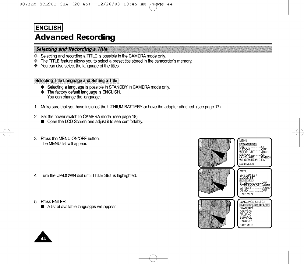 + Selecting and recording a TITLEis possible in the CAMERAmode onl7.