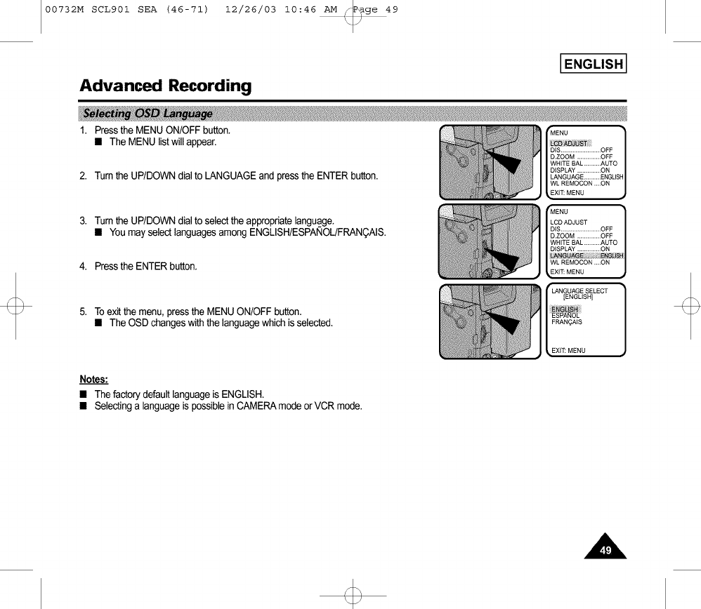 • Selecting a language is possible in CAMERA mode or VCR mode.