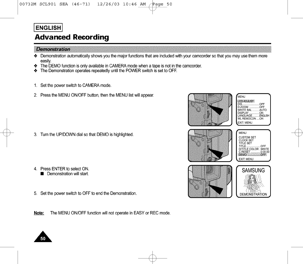÷ Demonstration automati_ly shows you the major functions that are included with your _mcorder so that you may use them more