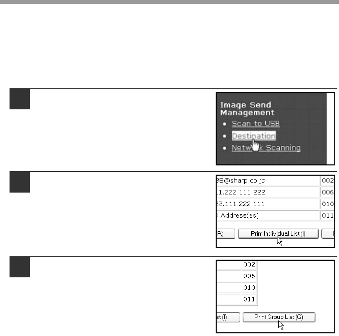 • Print individual list: Shows the information programmed in e-mail, FTP, desktop,