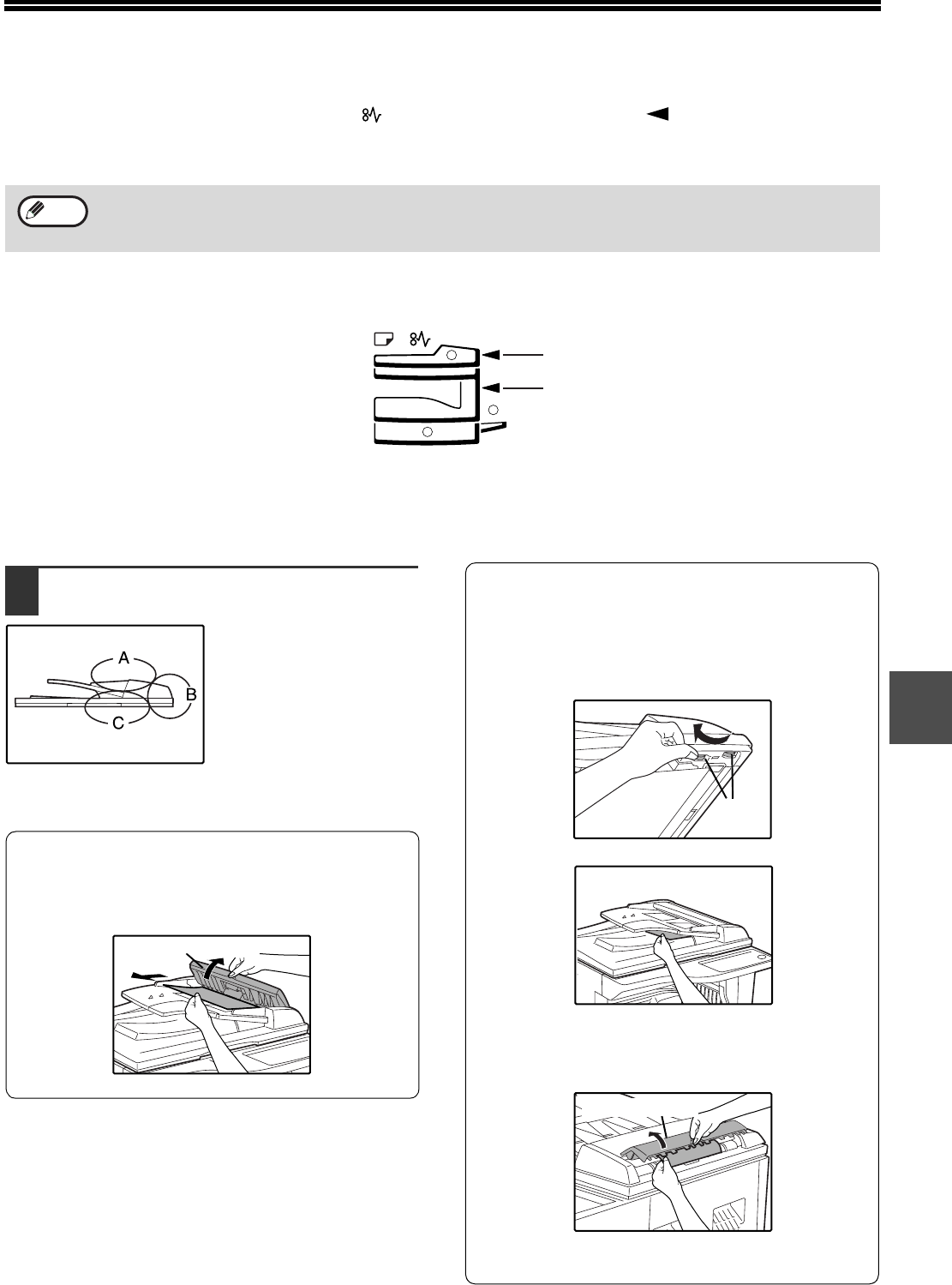 When a misfeed occurs, the misfeed indicator ( ) and a misfeed location indicator ( ) will blink and the machine