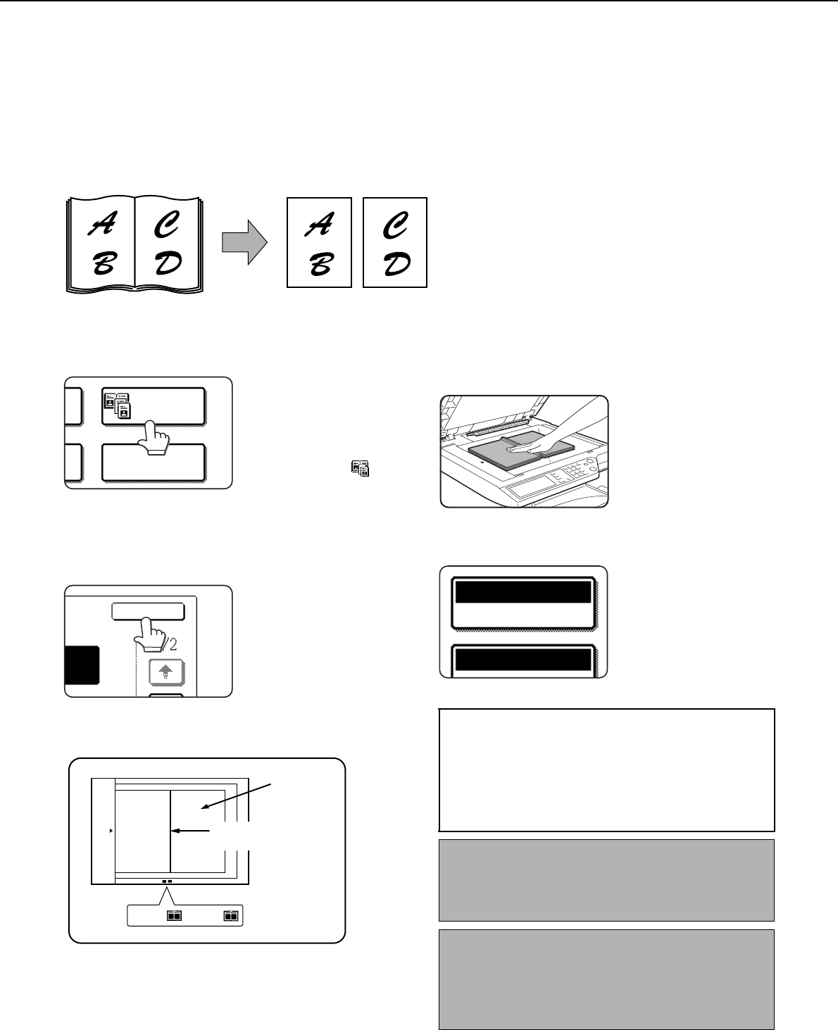 The dual page copy function produces separate copies of two documents placed side by side on the document glass.