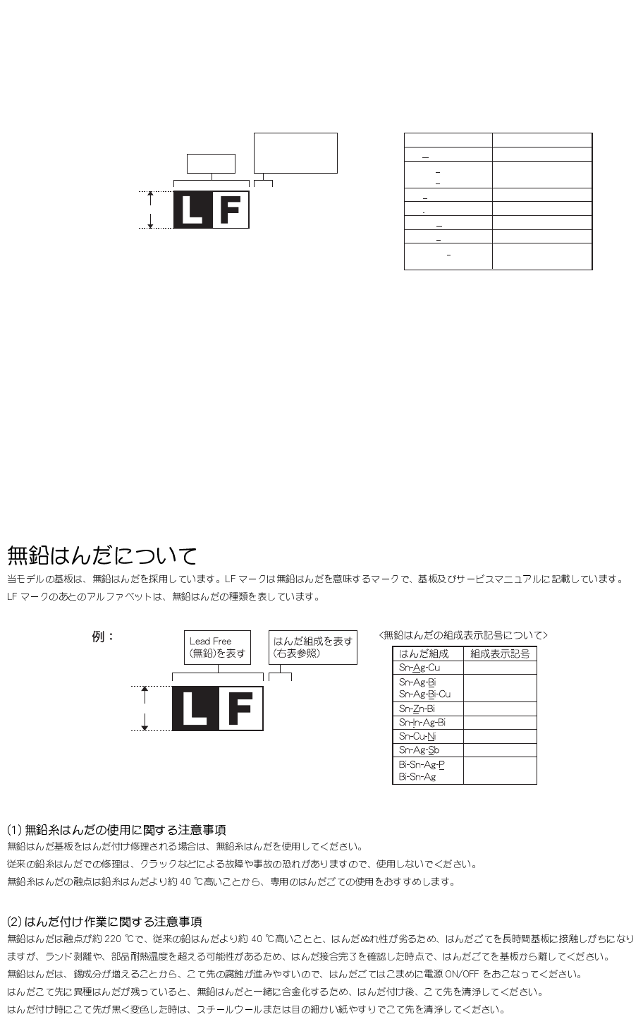 The PWB’s of this model employs lead-free solder. The “LF” marks indicated on the PWB’s and the Service Manual mean “Lead-Free” solder.