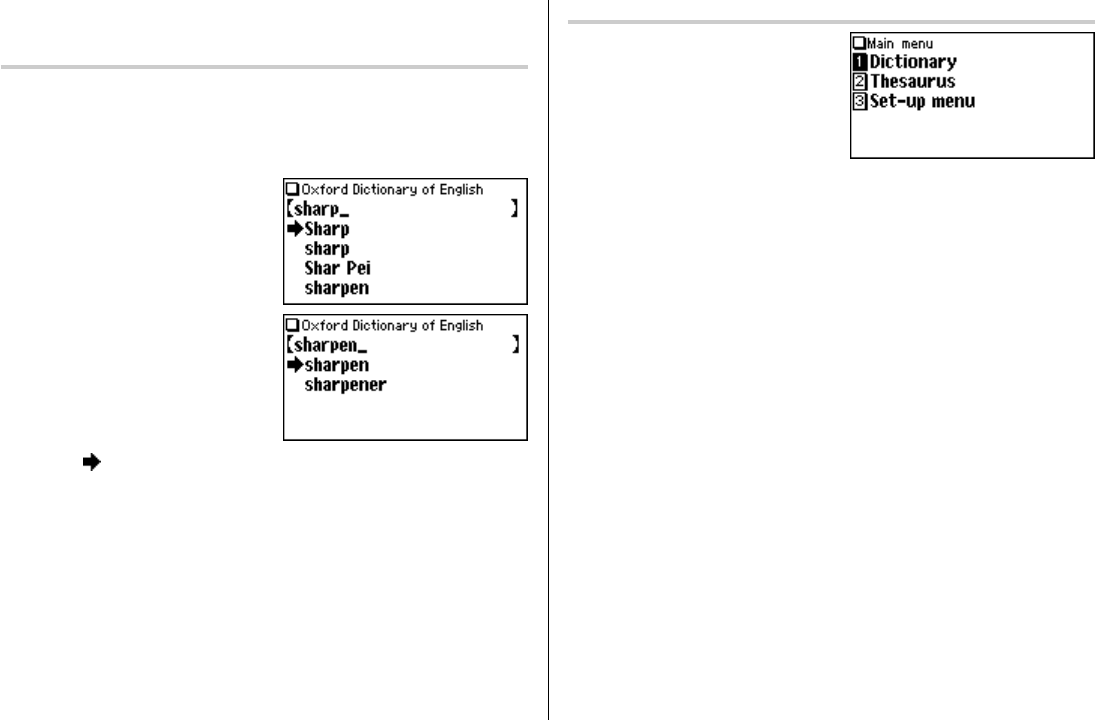 Selecting a dictionary / function in the main menu