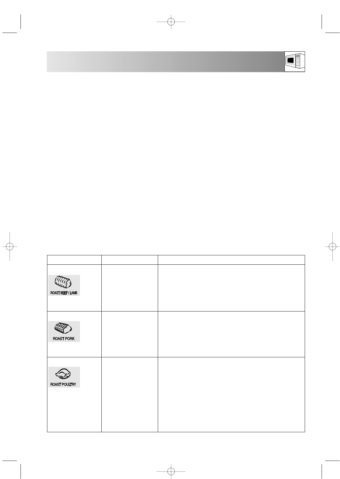 • To cook/defrost weights above or below that range or foods not included in the charts below, refer to the