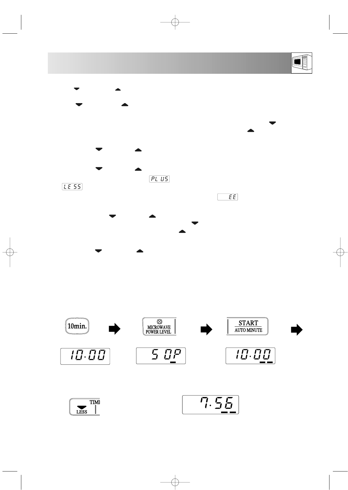 The LESS ( ) and MORE ( ) keys allow you to cook/defrost food for more or less time than the preset