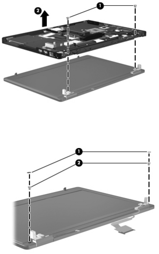 Remove the two Phillips PM2.5×3.3 screws (1) that secure the display assembly to the computer.