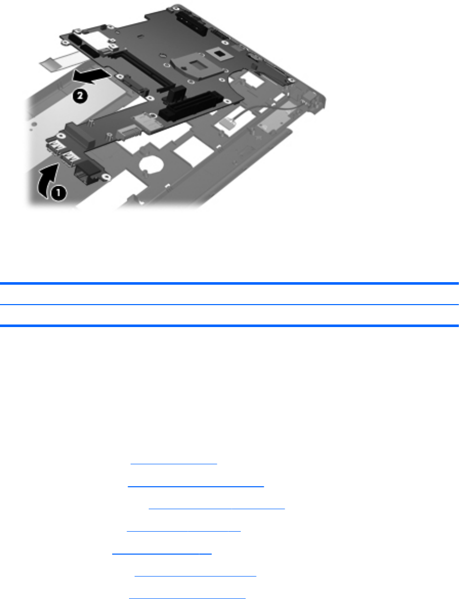 Remove the system board (2) by sliding it up and to the left at an angle.