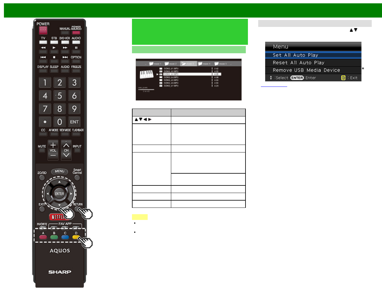 D (yellow)* Display the USB MENU screen.