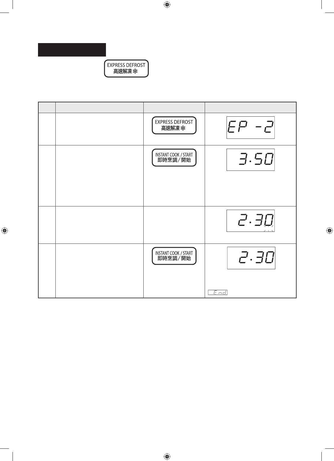 EXPRESS DEFROST rapidly defrosts 0.5 kg specifi c foods.