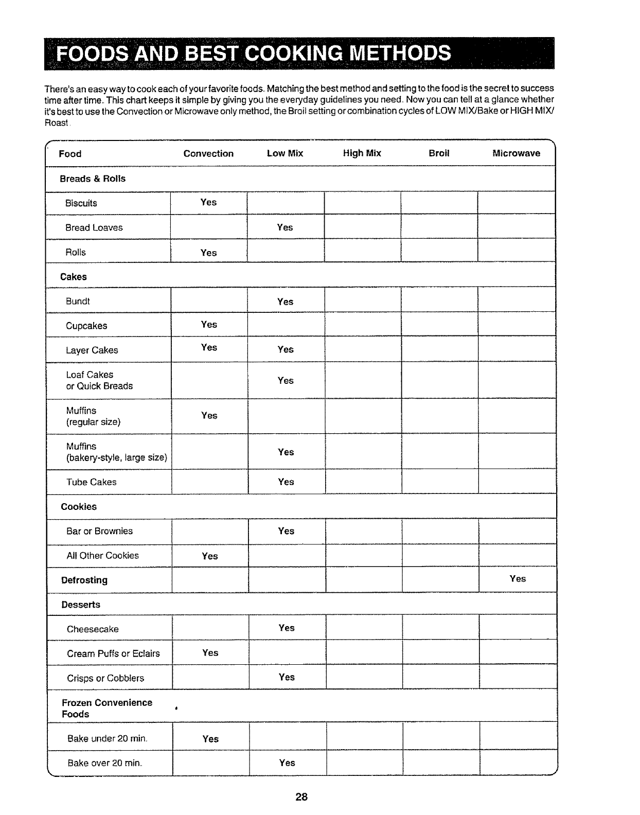 it'sbest to use the Convection or Microwave only method, the Broil setting or combination cycles of LOW MtX/Bake or HIGH MIX/