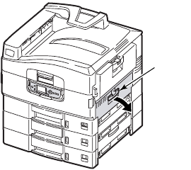 1. Squeeze the catch (1) on Tray 1 side cover and open the