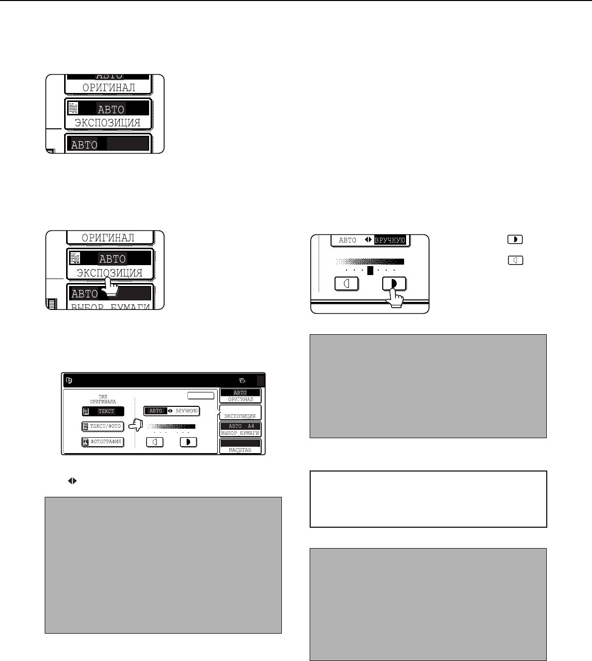 Выберите соответствóющий режим эêспозиции для êопирóемоãо ориãинала. Выбрать можно Авто, Теêст, Теêст/Фото и Фотоãрафия.