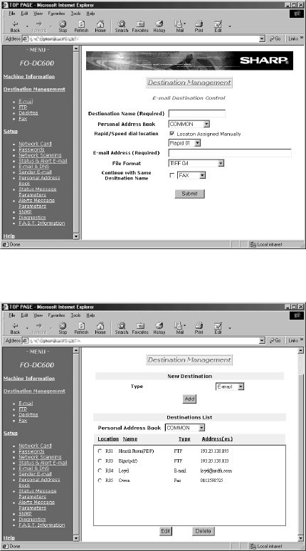 To store a destination, click the desired destination type (E-mail, FTP, or Fax)