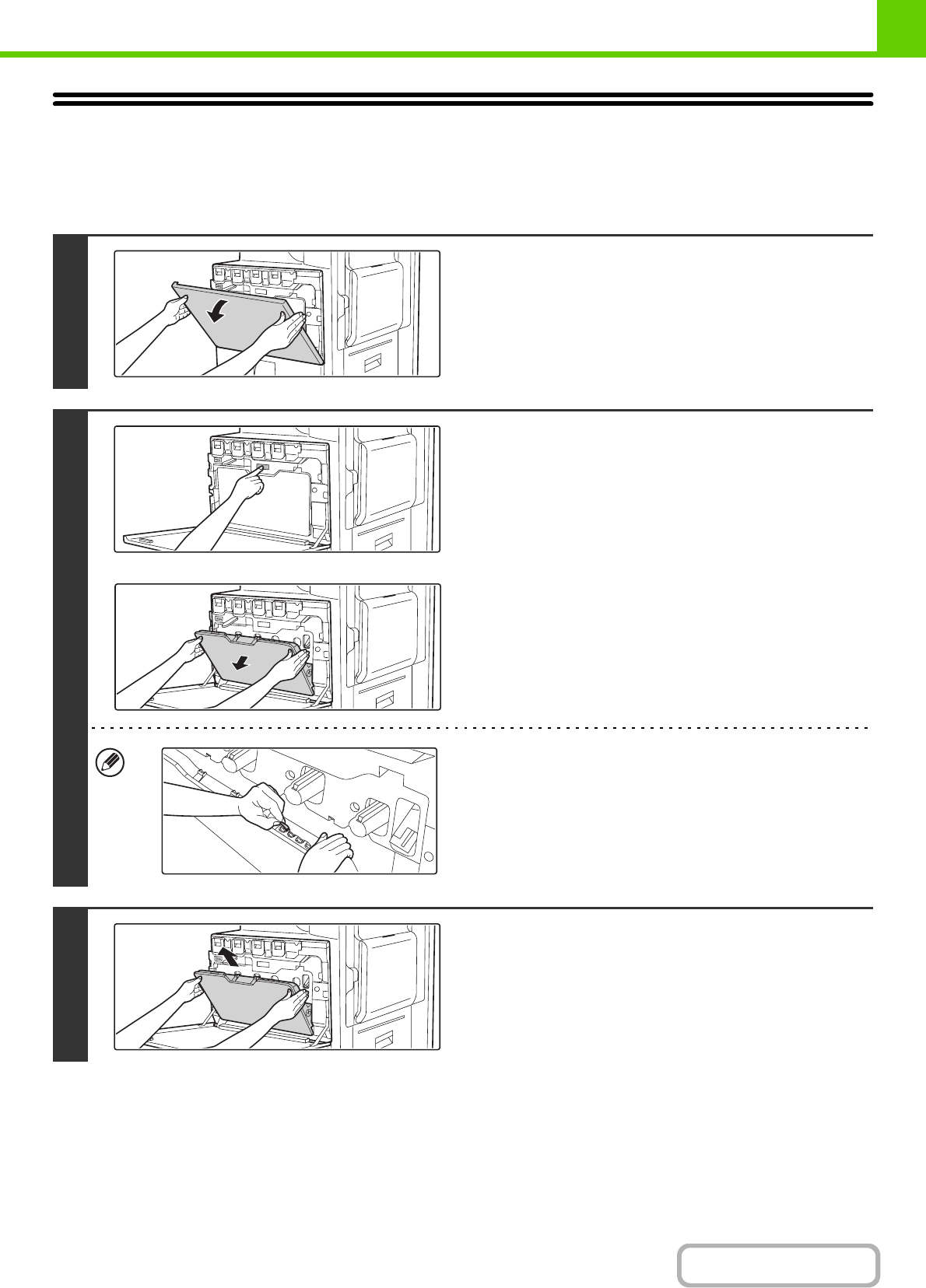 "Replace used toner container." will appear. Follow the procedure below to replace the waste toner box.