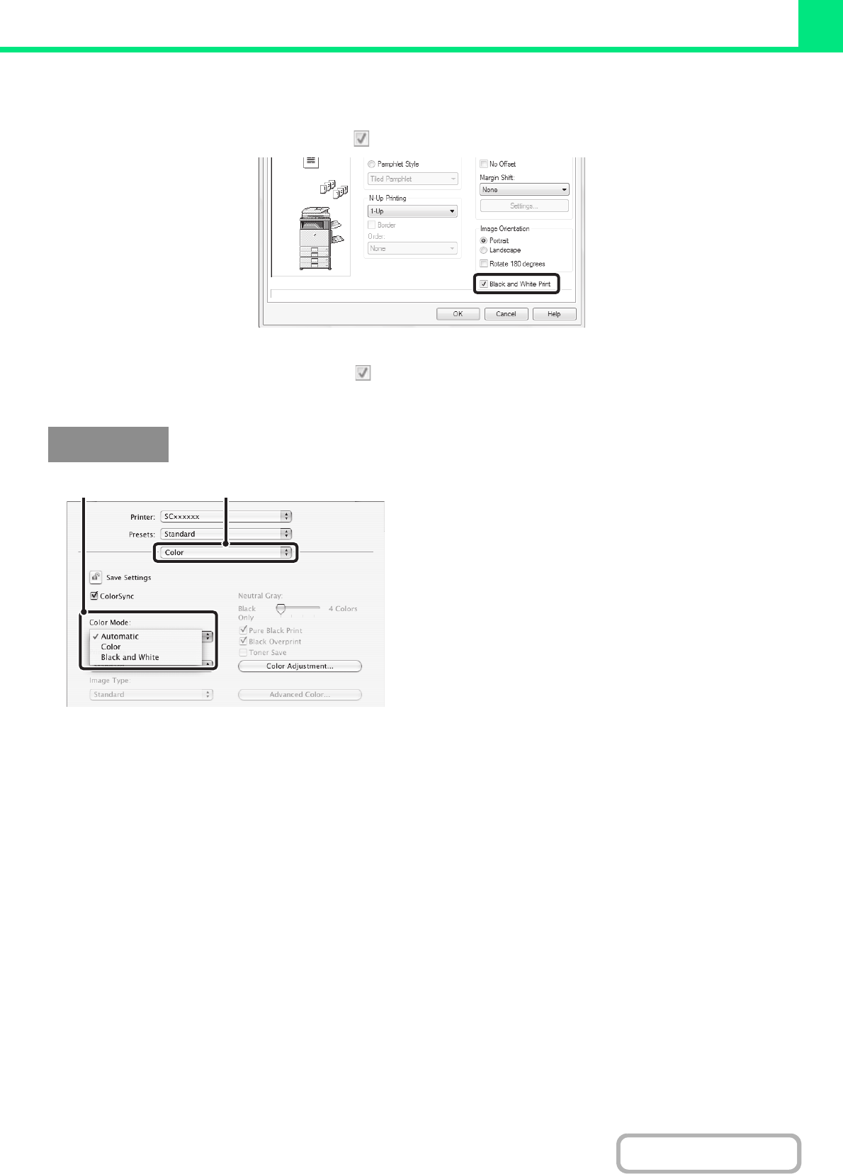[Black and White] can be selected on the [Main] tab as well as on the [Color] tab. Click the [Black and White Print]