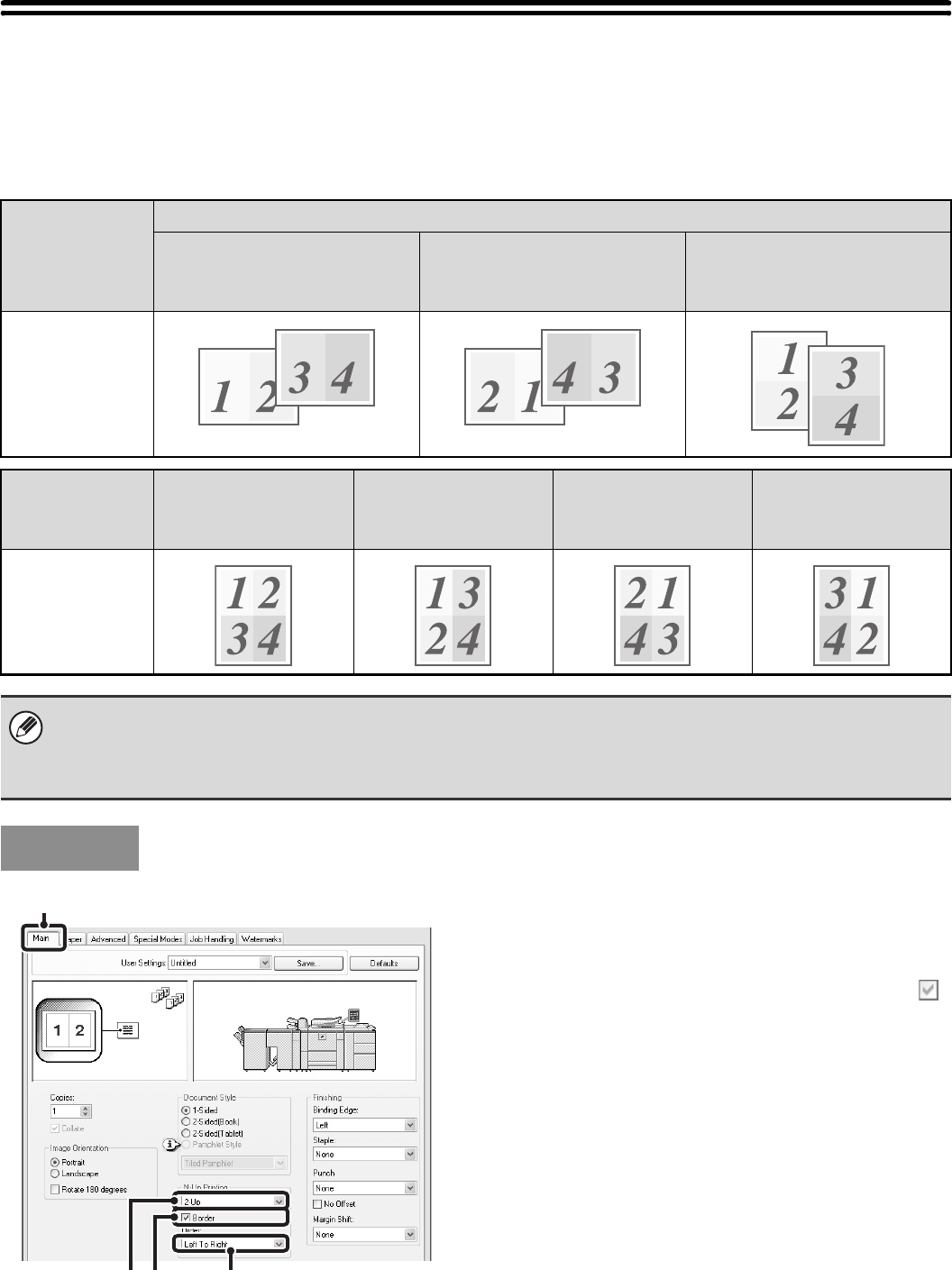For example, when [2-Up] (2 pages per sheet) and [4-Up] (4 pages per sheet) are selected, the following print results will