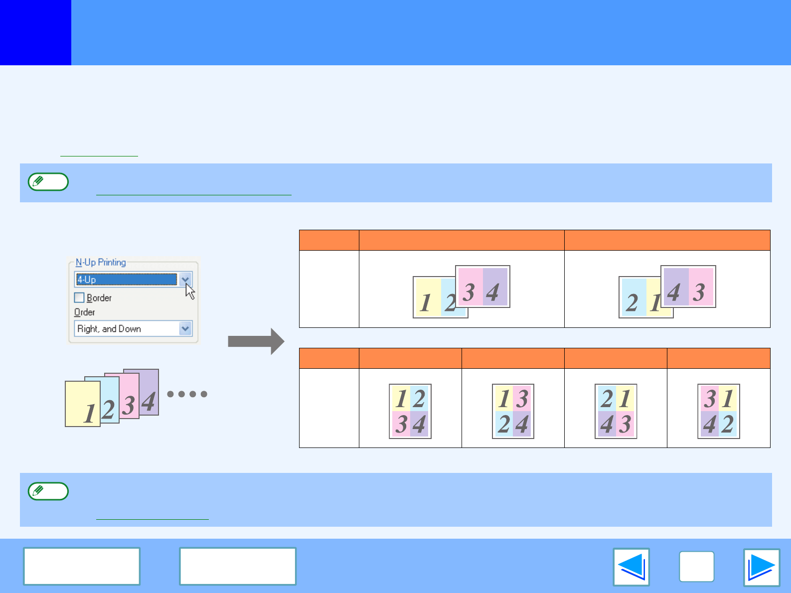 For example, when "2-Up" or "4-Up" is selected, the result will be as follows depending on the selected order.