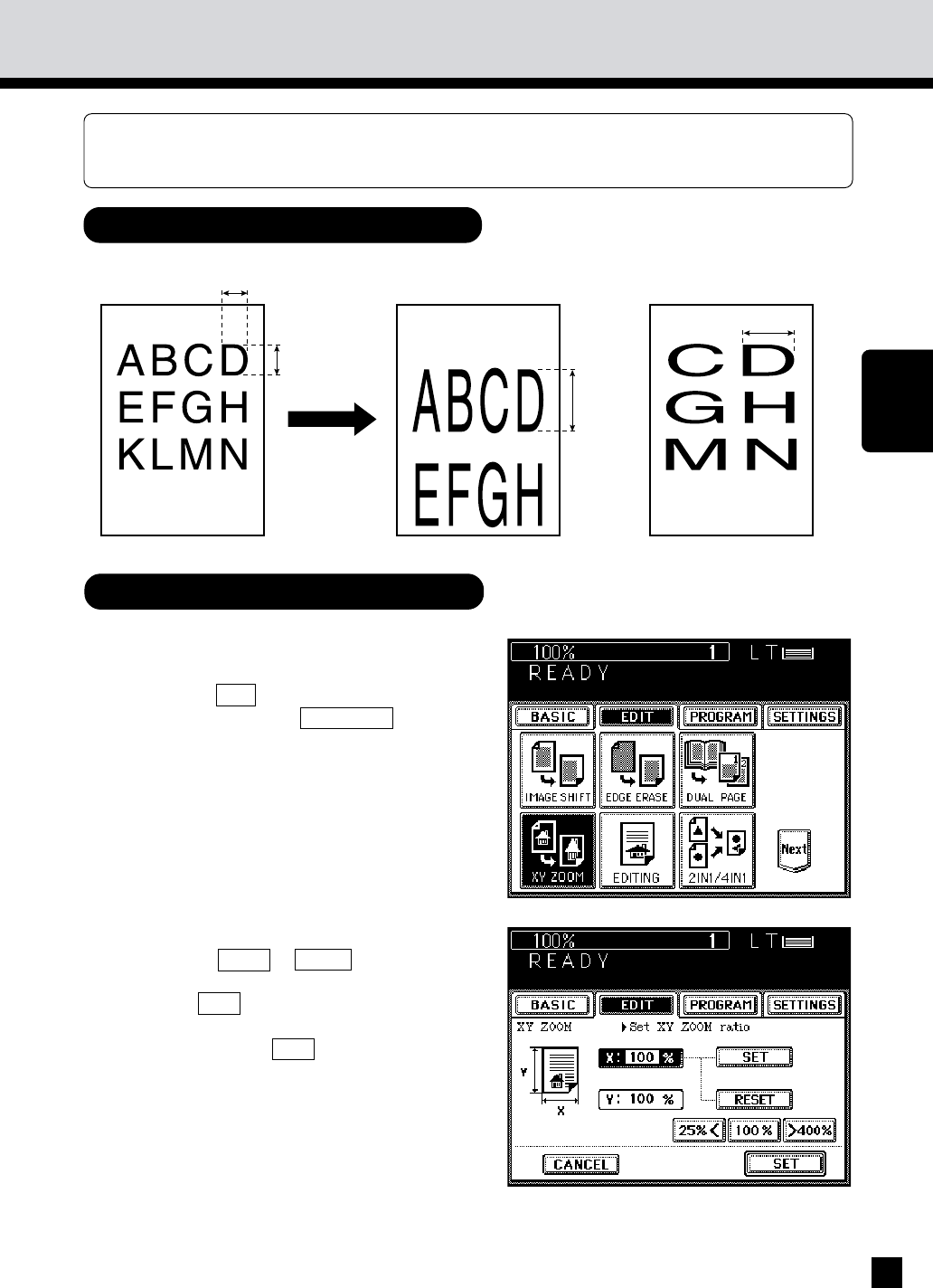 This function allows you to make copies of originals with the reproduction ratio of the X and