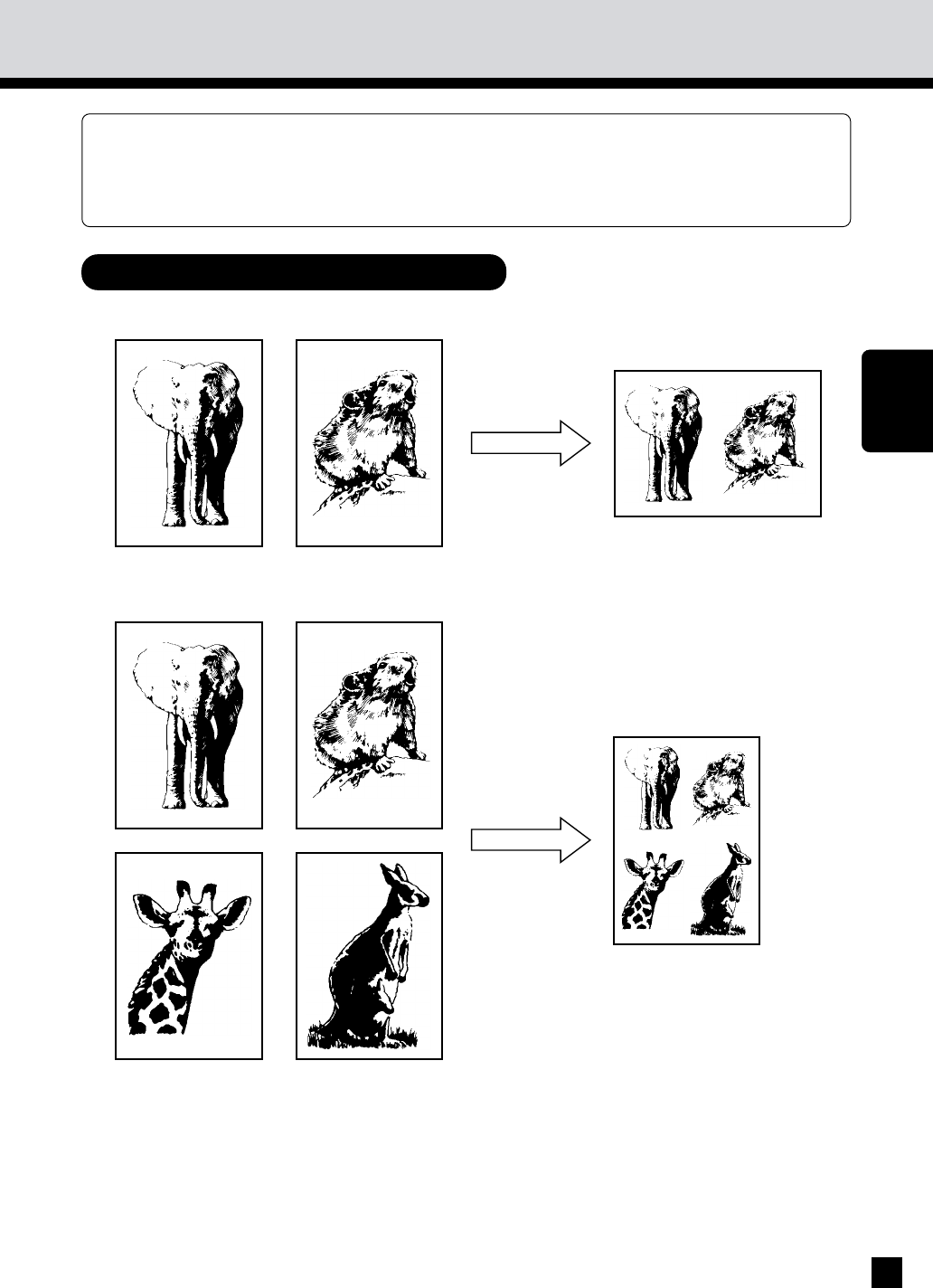 This function allows you to reduce and copy two or more originals onto a single sheet. Reducing