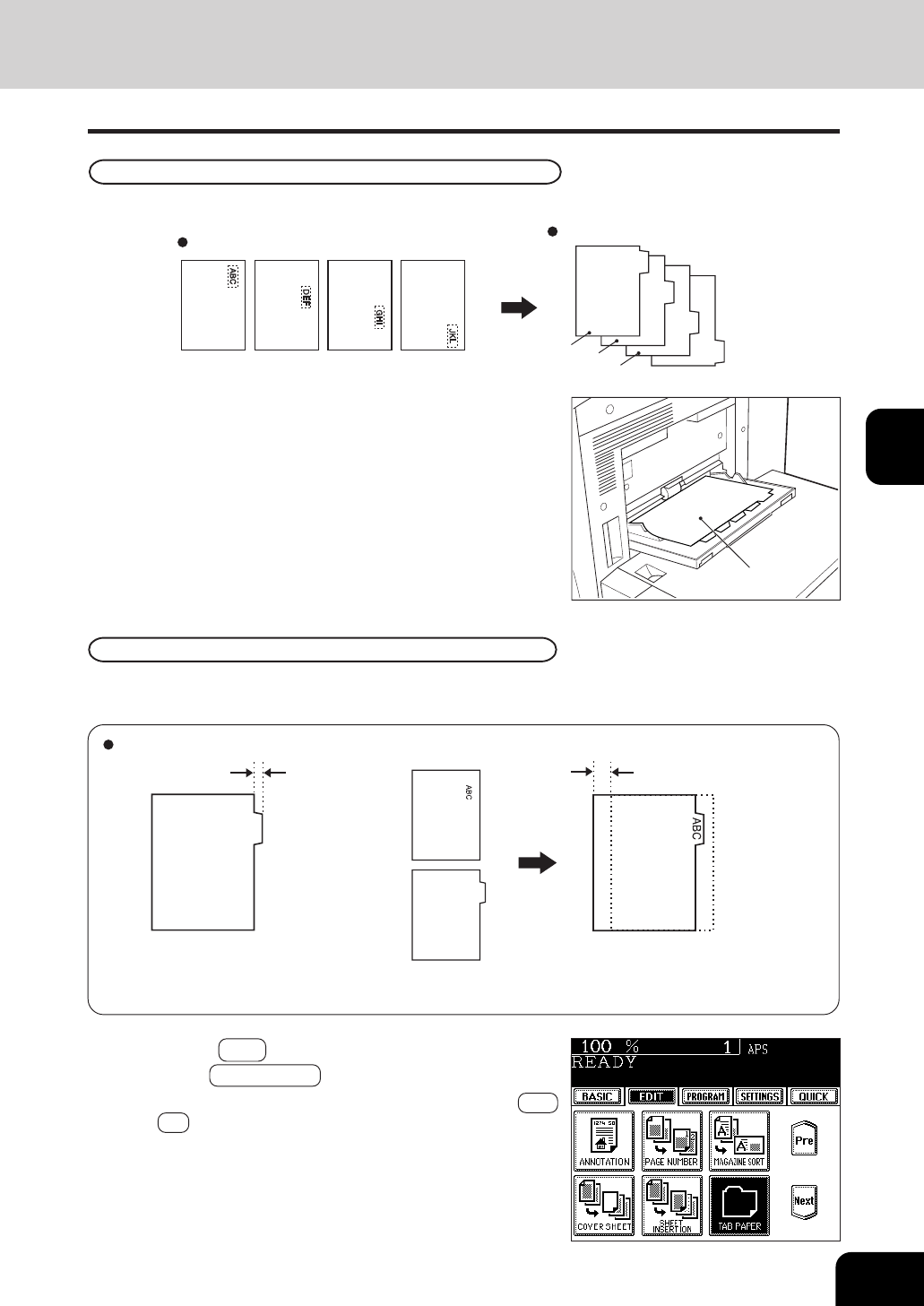 To copy on tab paper, adjust both the tab width and the shift width for the drawer and the bypass guide