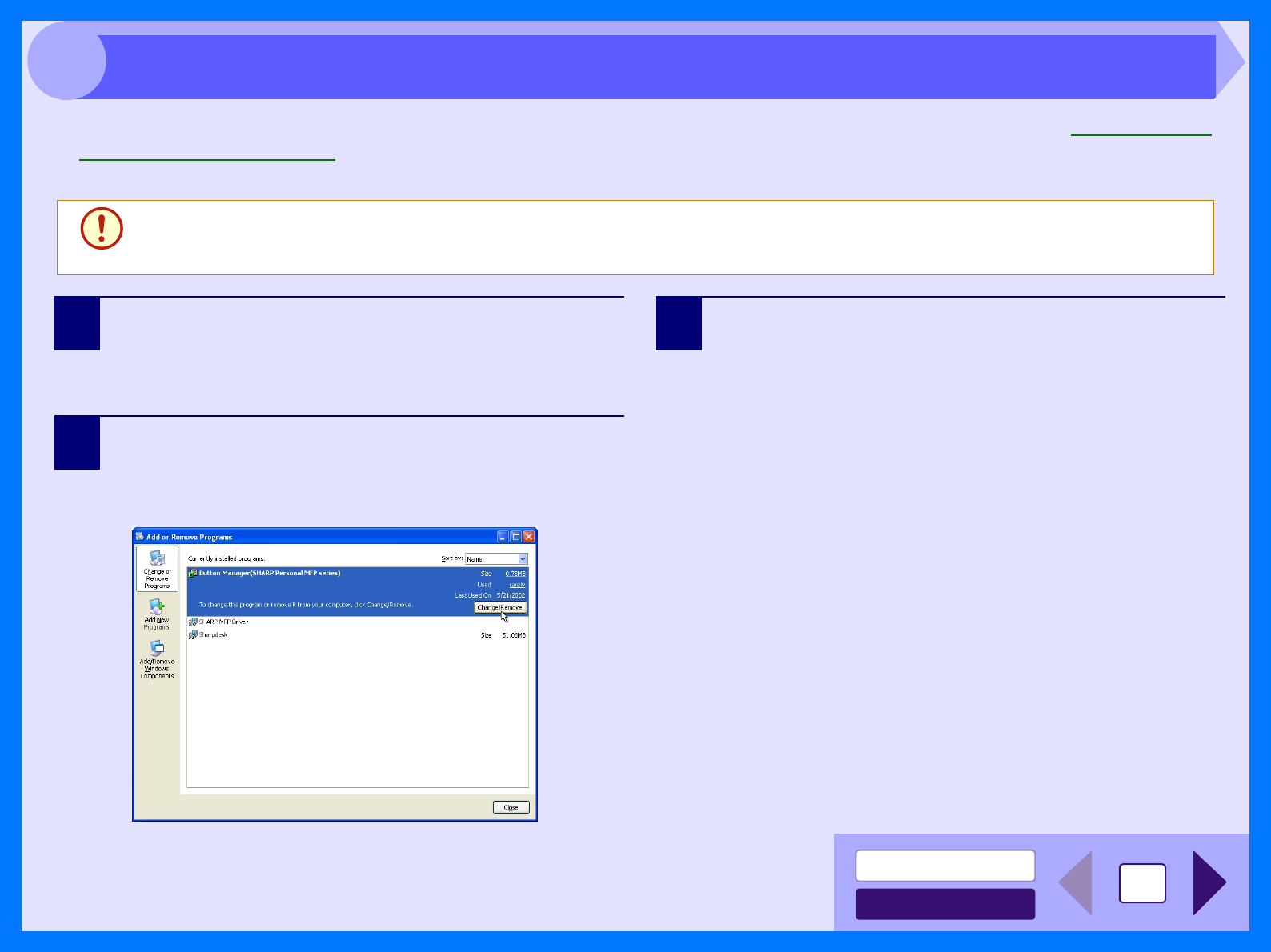 Delete the "SHARP MFP driver" and the "Button Manager