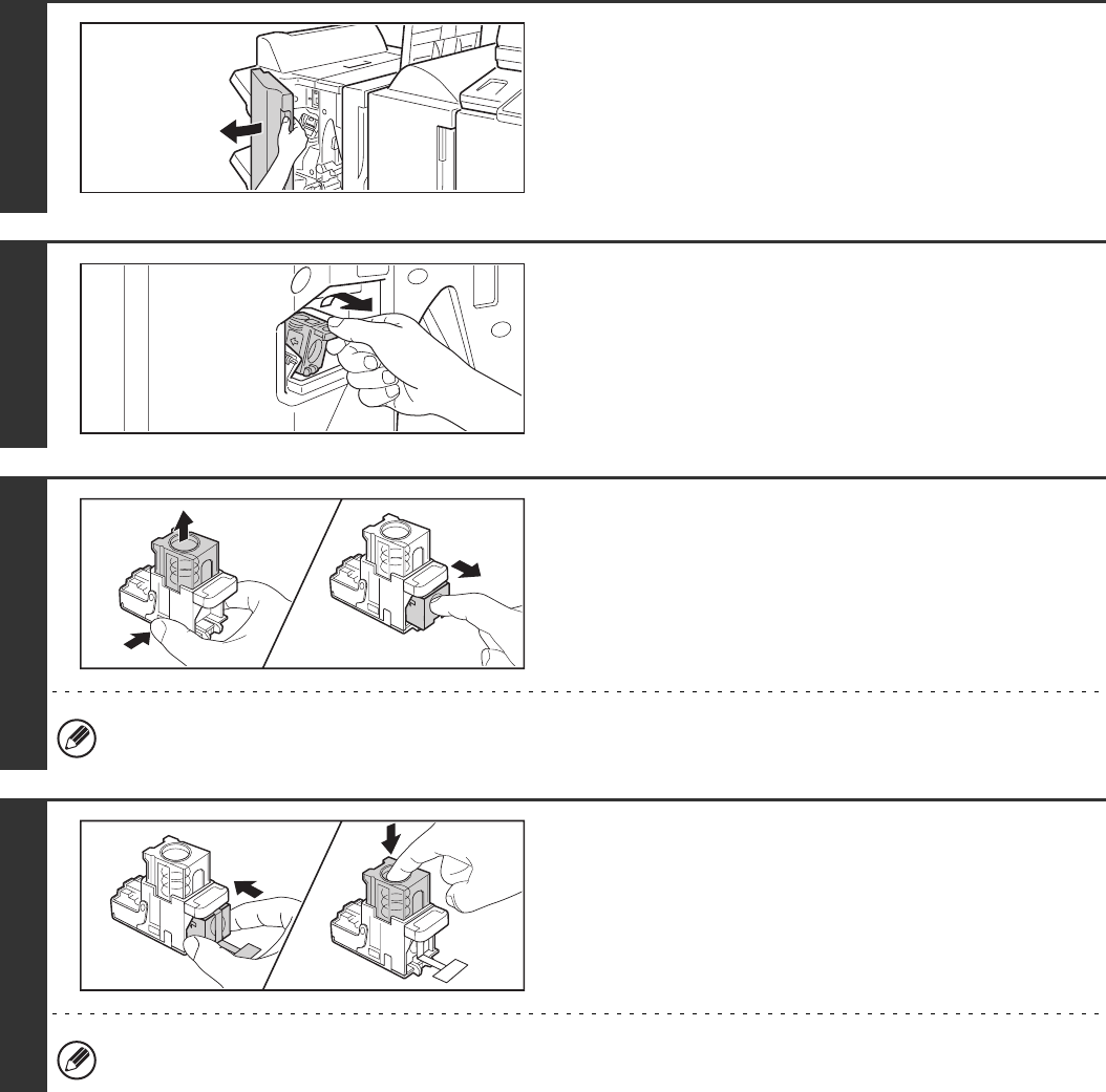 When the staple cartridge runs out of staples, a message will appear in the operation panel. Follow the procedure below