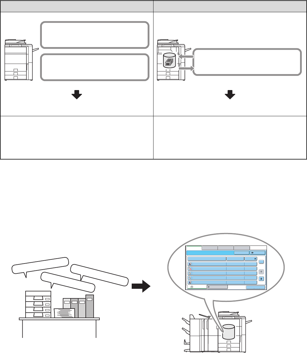 As shown in the example, storing a job with the document filing function frees you of the need to rescan the original and