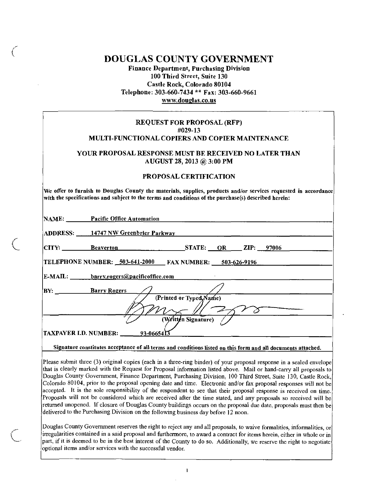 Colorado 80104, prior to the proposal opening date and time. Electronic andlor fax proposal responses will not be