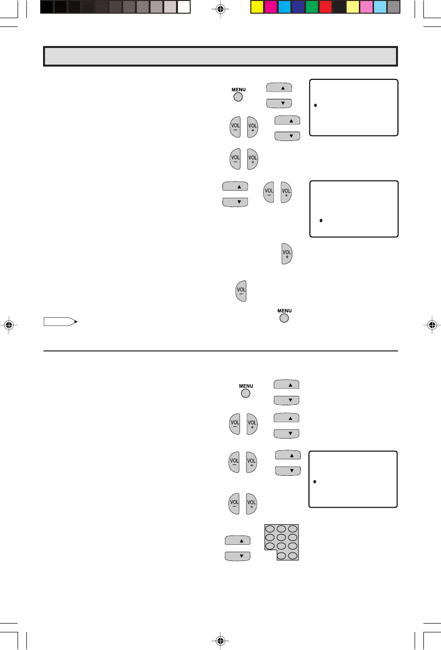 4 Press VOL +/– to access CH MEMORY.