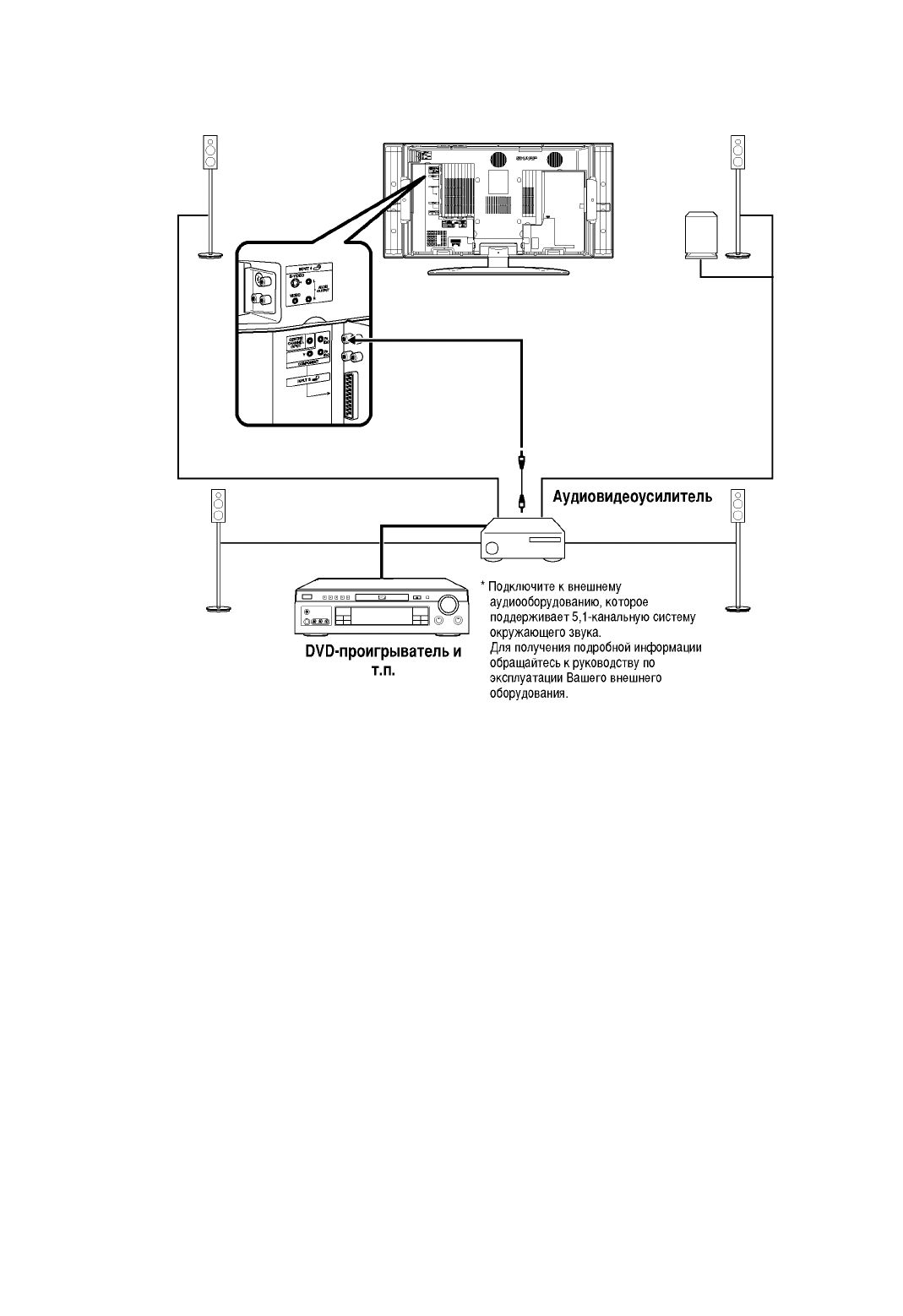 При использовании 5,1-канальной системы окружающего звука Вы можете использовать громкоговоритель в качестве
