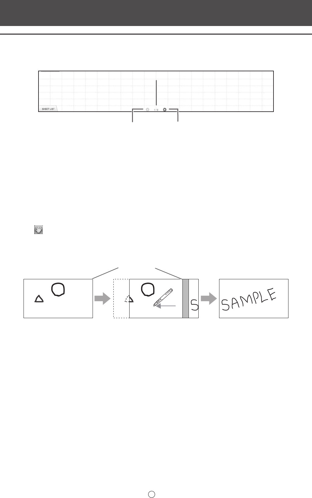 To change the sheet, touch the sheet navigation button at the bottom of the screen. The number shown at the center is the page